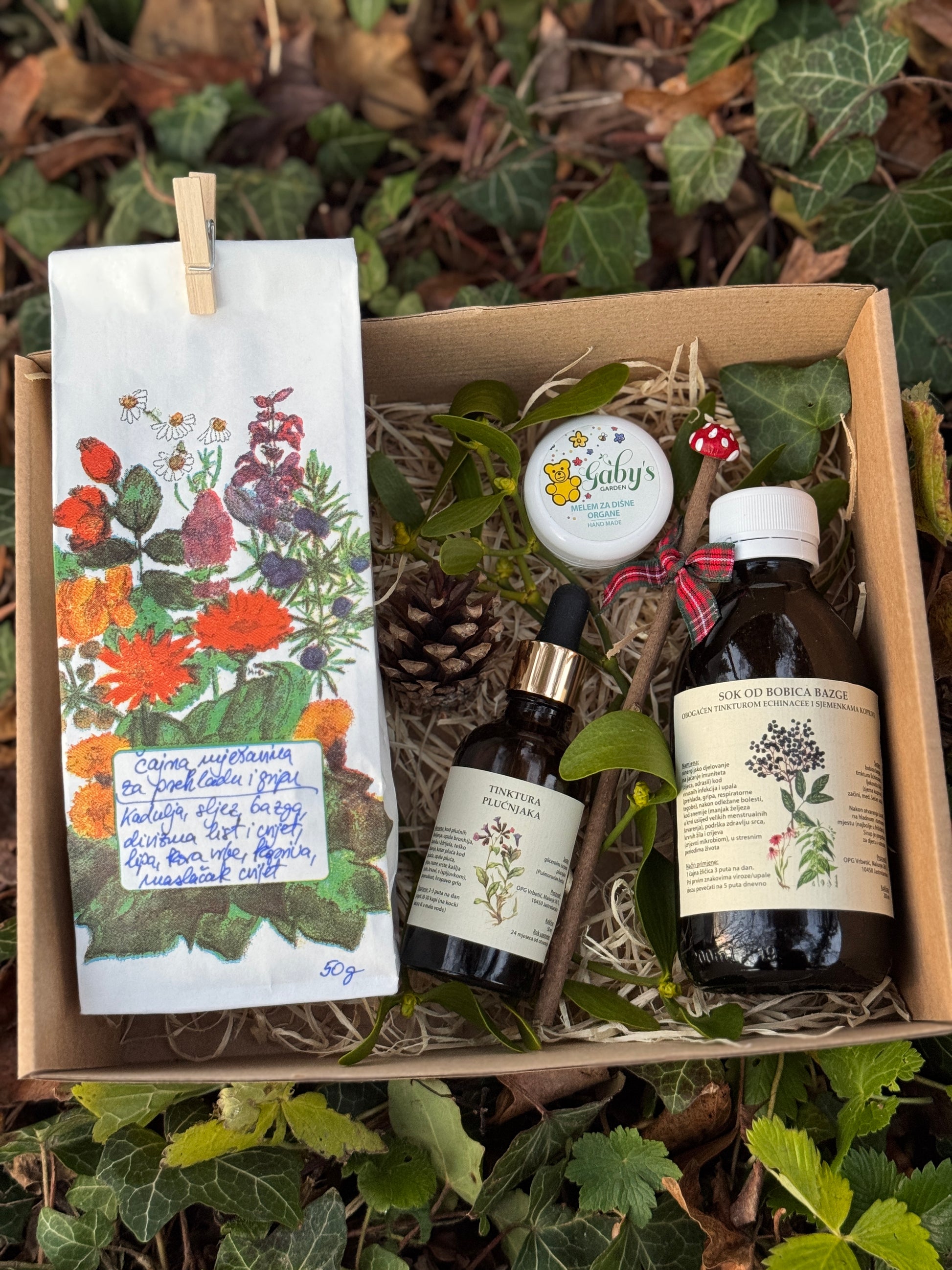 4. Čajna mješavina za prehladu u gripu (50 g) - sadrži bilje koje sadrži sluzi koje oblažu oboljela pluća: sljez, divizmin list i cvijet te biljke sa protuupalnim djelovanjem: list i cvijet končare i koru vrbe. Sadrži i drugo bilje koje pomaže kod prehlade, gripe, kašlja i upala (kadulja, lipa, itd.)
